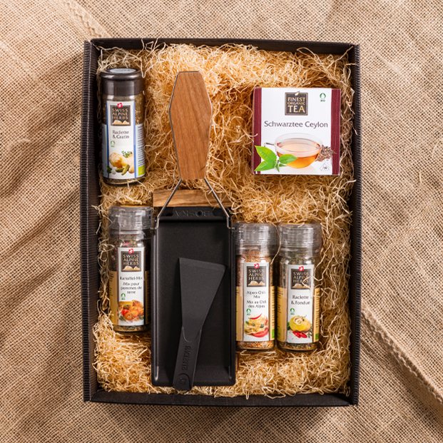 Avec le set à raclette portable, il devient possible de faire fondre de délicieux fromages à tout moment et en tout lieu, que ce soit au parc, chez des amis à la maison ou sur la terrasse du toit. Après utilisation, le set se plie facilement et se range sans prendre de place. Le poêlon, qui convient également pour les barbecues grâce à son revêtement antiadhésif, rend ce set particulièrement polyvalent. Pour compléter l'expérience de la raclette, notre thé noir bio de qualité supérieure, vendu dans un set pratique de 14 pièces, est un must absolu. Nous proposons en outre une sélection exquise d'épices qui se marient parfaitement avec la raclette, la fondue et les plats de pommes de terre.