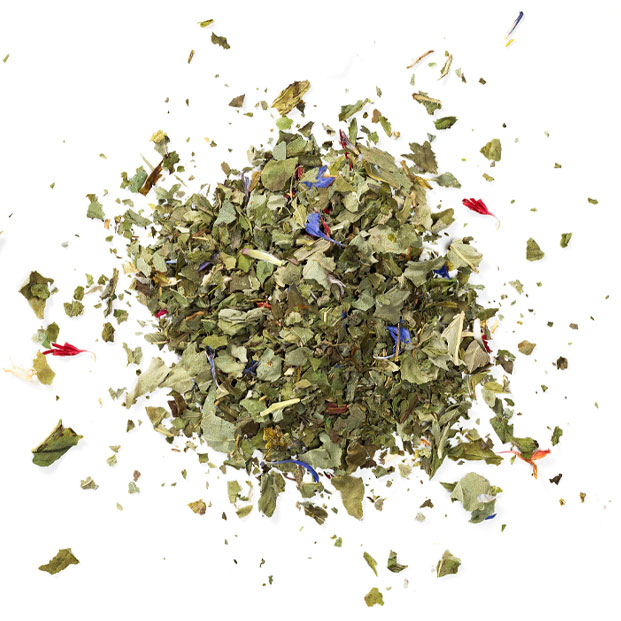 Mélisse rose (CH), menthe nana (CH), menthe orange (CH), menthe pomme (CH), mélisse dorée (CH), bleuets (CH).