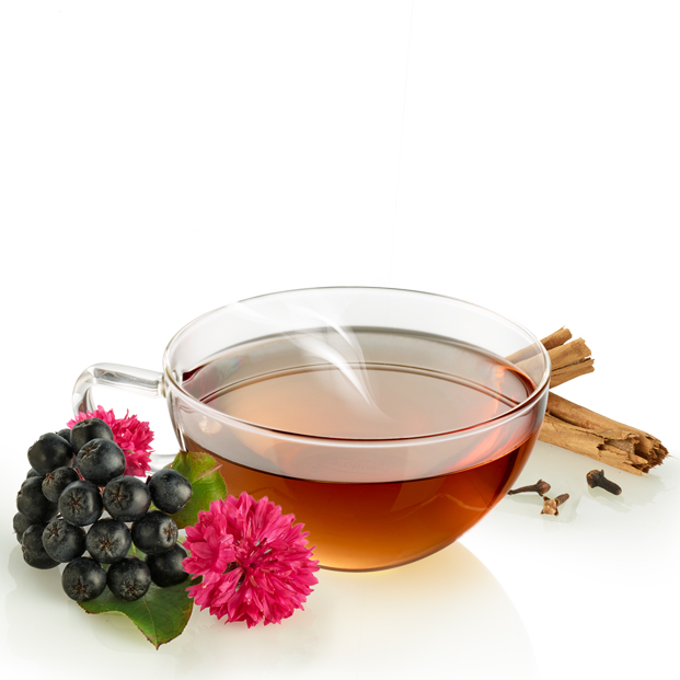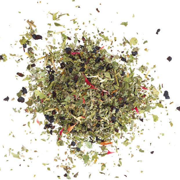 Baies d’aronia (CH), mélisse dorée (CH), menthe pomme (CH), ortie (CH), hibiscus, baies de genévrier, bleuets (CH), clous de girofle, cannelle.