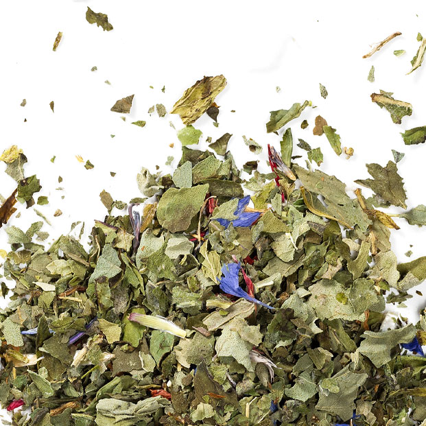Rosenmelisse, Marokkanische Minze, Orangenminze, Apfelminze, Goldmelisse, Kornblumen rot und blau. Alle landwirtschaftlichen Zutaten stammen aus biologischer Landwirtschaft.